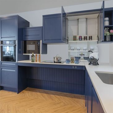 Designed to cater to the needs of wheelchair users, this innovative solution provides seamless access to both the hob and sink. What sets this kitchen apart is its adaptability, allowing other family members to effortlessly adjust the worktop to standard height or higher as needed. We've incorporated an extra shallow sink to enhance accessibility further and ensure ease of use. Ample storage is provided with a tall larder unit, offering practicality without compromising on storage space.